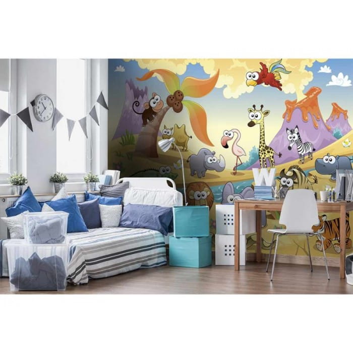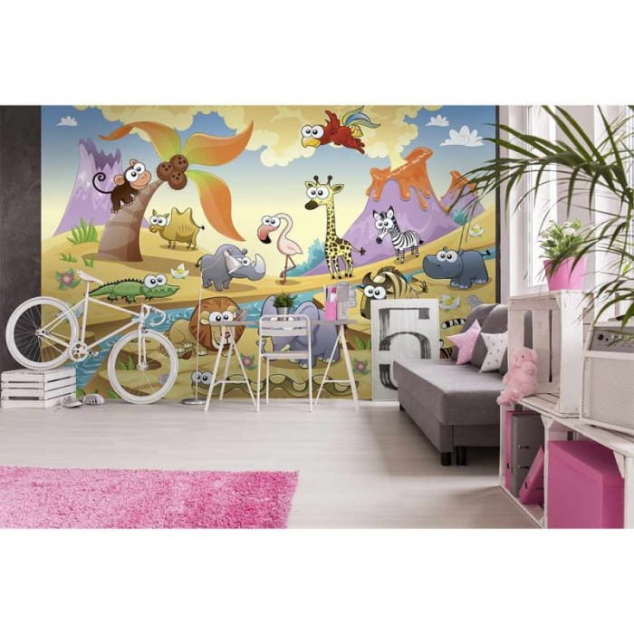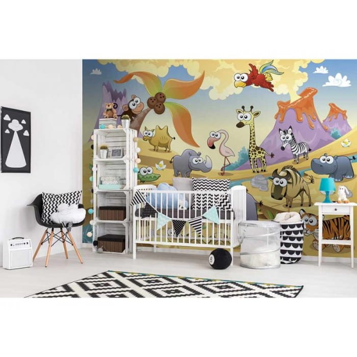 Fototapeta na flizelinie "Savanna Animals" to bogata w elementy i kolory ilustracja, która ożywi pokój chłopca i dziewczynki. Słoń, tygrys, lew, żyrafa, flaming...nie sposób wymienić wszystkich, przedstawionych tu zwierząt, to istny ogród zoologiczny! Ilustracja będzie kreatywnym, pobudzającym wyobraźnię ale też edukacyjnym elementem dziecięcego wnętrza. Ciepłe kolory stworzą przytulny nastrój.
