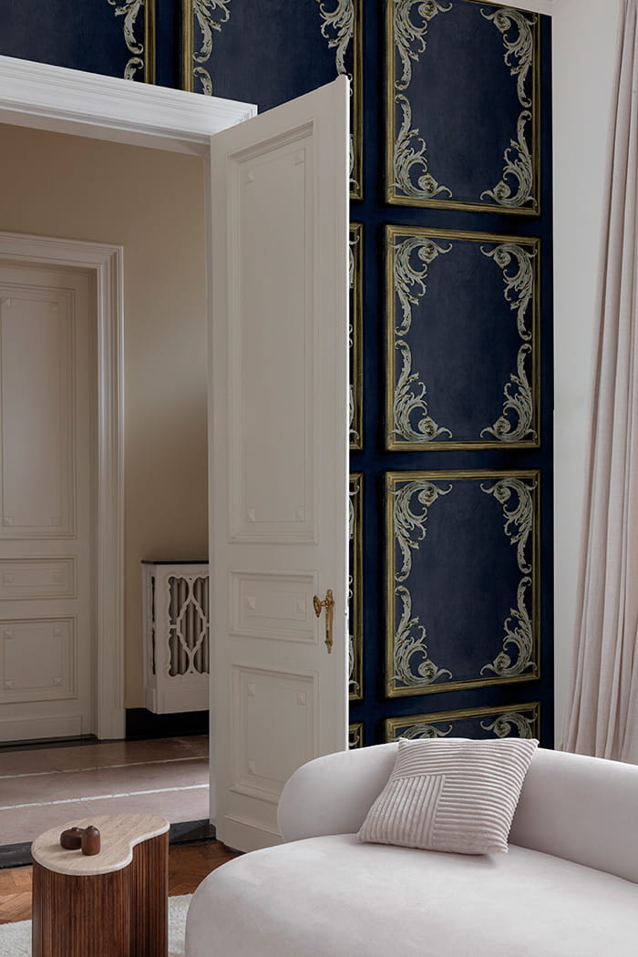 Prezentowana tapeta ścienna o numerze 19105 to wyrafinowana dekoracja ścienna o klasycznym charakterze, która emanuje elegancją i luksusem. Wzór przedstawia dekoracyjną, malowaną ramę, z bogato zdobionymi, złoconymi ornamentami w stylu barokowym. Centralna część tapety jest utrzymana w głębokiej barwie, co podkreśla elegancki charakter projektu. Złote elementy zostały podkreślone subtelnym, metalicznym połyskiem, co wzmacnia autentyczność wzoru. Tapeta doskonale odnajdzie się w klasycznych, bogato zdobionych wnętrzach, w których ma przewodzić luksusowy styl. Może też być awangardowym dopełnieniem nowoczesnej aranżacji. Idealnie pasuje do salonu, sypialni, czy też biura. Może być używana jako centralny element dekoracyjny na ścianie, imitując eleganckie panele. Struktura tapety jest gładka, wyczuwalnie szorstka w dotyku. Podłoże tapety winylowe na flizelinie, odporne na szorowanie, dzięki czemu utrzymanie tapety w czystości nie będzie stanowiło problemu.