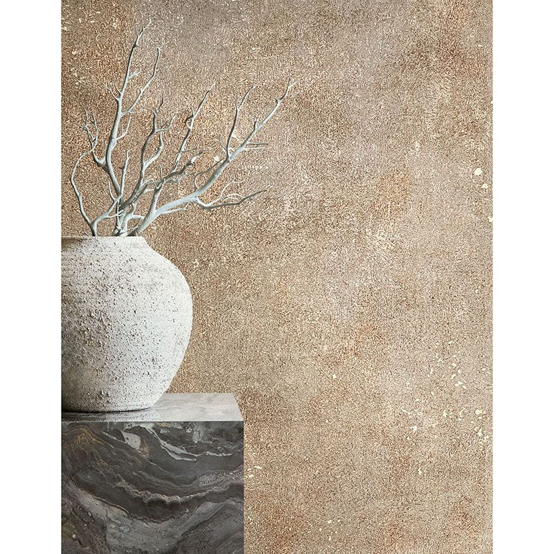 Powierzchnia tapety jest matowa w odcieniach szarości i brązu z elementami błyszczących przetarć oraz refleksów w kolorach miedzianym i starego złota.