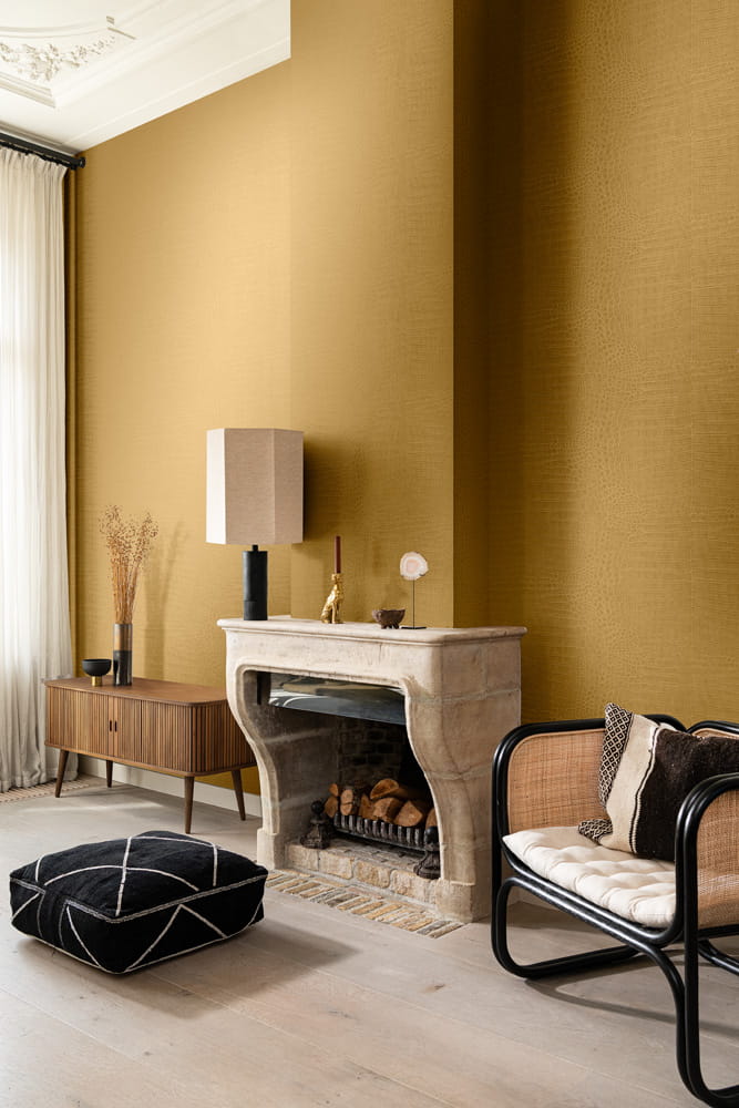 Powierzchnia tapety posiada w pełni połyskującą poświatę i jest w kolorze starego złota.